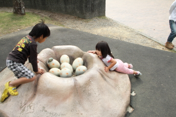 中央広場の恐竜のレプリカにも、ずいぶん食いついていました。その中でもお気に入りだったのは、恐竜のたまご。かなり長いこと遊んでいました。